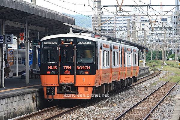 抵達並緩緩駛離浦上站的豪斯登堡塗裝之SSL快速列車