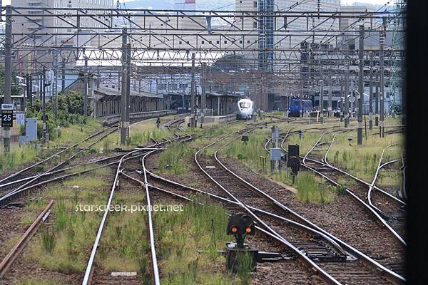 快速列車從3番線出發後,股線併至885系列車的4番線前方