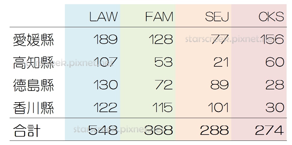 日本四大便利商店體系截至2016年2月底在四國地區的店舖數